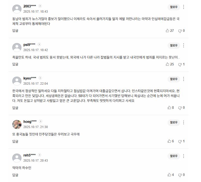 全体として、東南アジアでの韓国人を標的とした犯罪への警戒感と、詐欺犯罪への強い怒りが表れたコメント欄となっています。